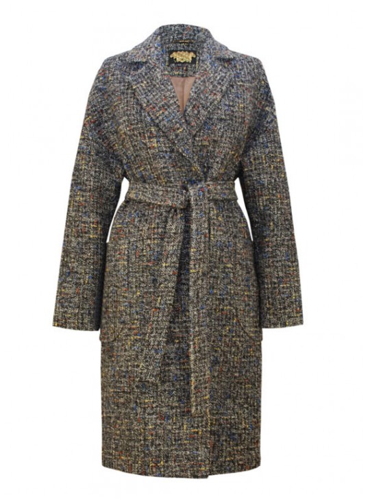 Классическое женское пальто прямого покроя, выполненное из мягкой твидовой ткани меланж. Английский воротник, пояс из этой же ткани, накладные карманы. На кнопках-застежках. Слегка заужено к низу. Длина по спине: 100 см.