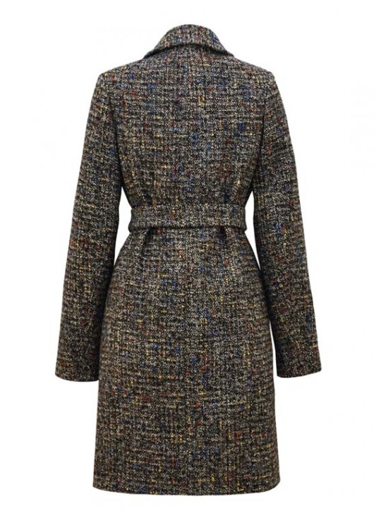 Стильное строгое женское пальто-тренчкот, выполненное из мягкой ткани цвета темно-серый меланж. Английский воротник. Декорировано кокеткой. На пуговицах. С поясом-ремешком, выполненным из этой же ткани. Карманы втачные. По задней планке шлица. Длина по спине: 100 см.